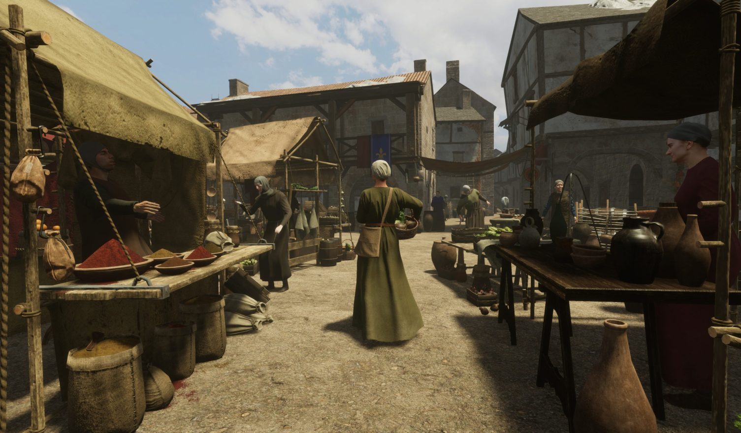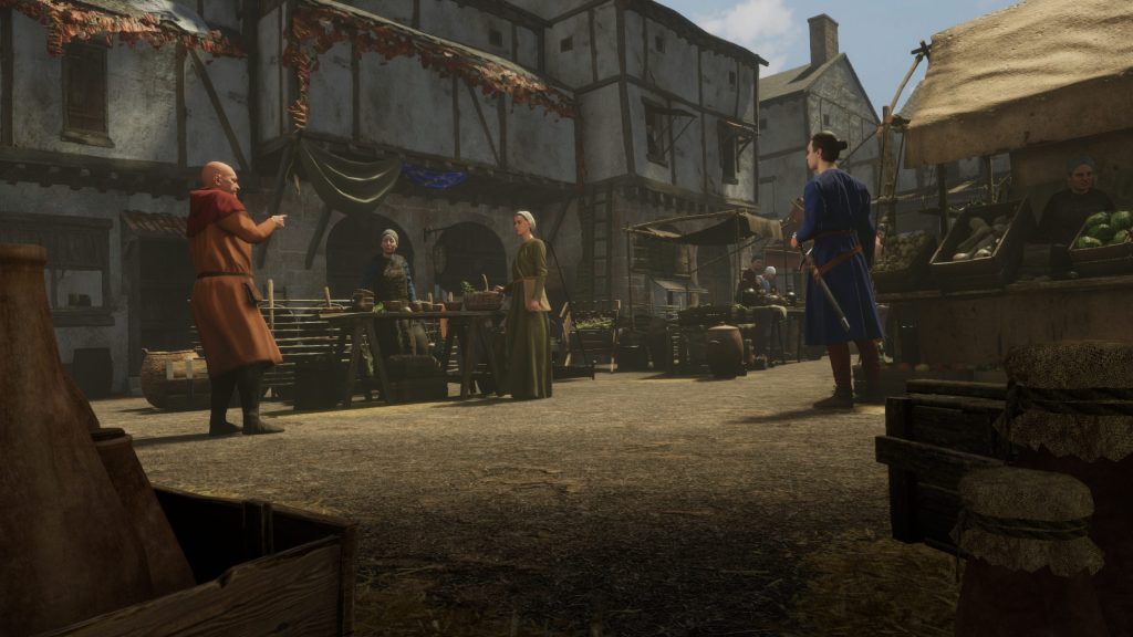La scène du marché de Carcassonne illustre parfaitement le défi de l’optimisation en VR. Un marché est par nature dense et vivant : étals, paniers, outils, armes, étoffes.